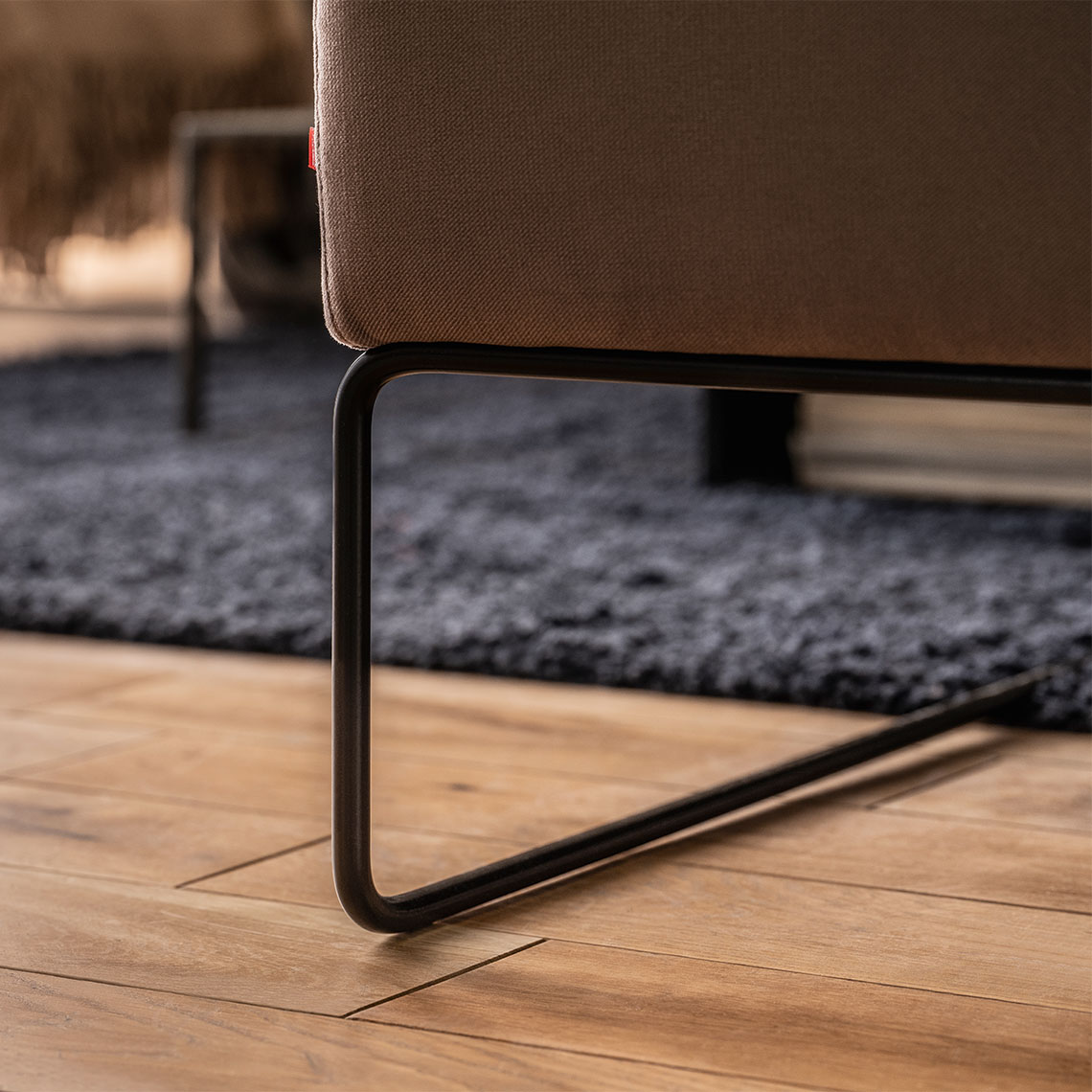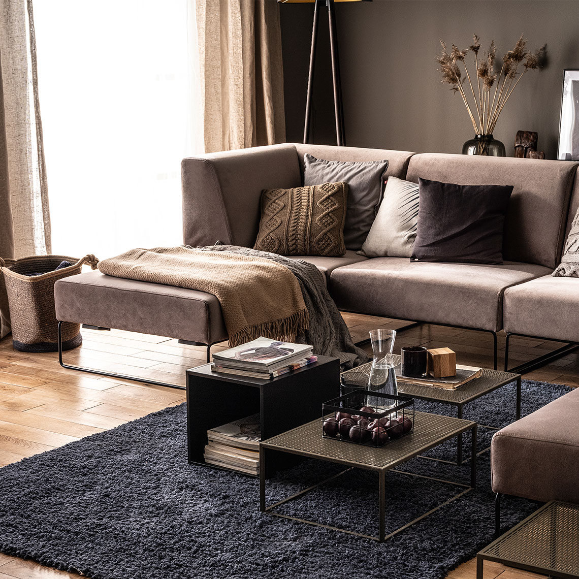 - Ażurowa podstawa dodaje narożnemu modułowi lekkości. Cienkie czarne nóżki prezentują się nowocześnie i zapewniają łatwy dostęp do podłogi pod meblem.