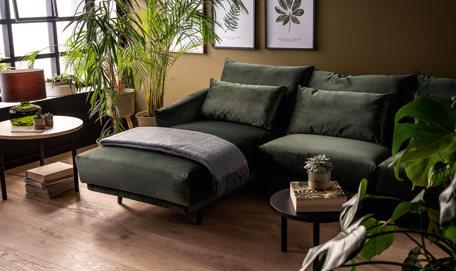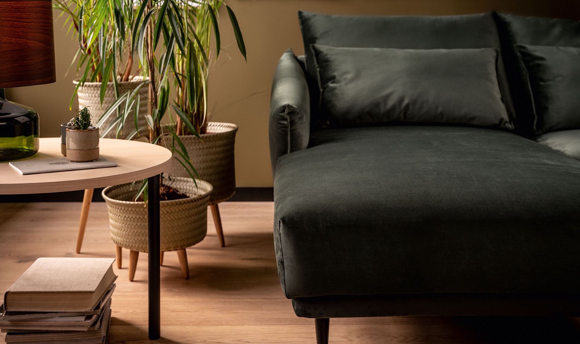Narożnik Duvet to miękki mebel wypoczynkowy dla całej rodziny. Posiada dodatkowe poduszki dekoracyjne i eleganckie cienkie podłokietniki, zaprojektowane z myślą o ergonomii. Narożnik jest produkowany na zamówienie – kupujący decyduje o tkaninie tapicerskiej i kolorze nóżek. Do wyboru jest wersja z szezlongiem po lewej lub prawej stronie.