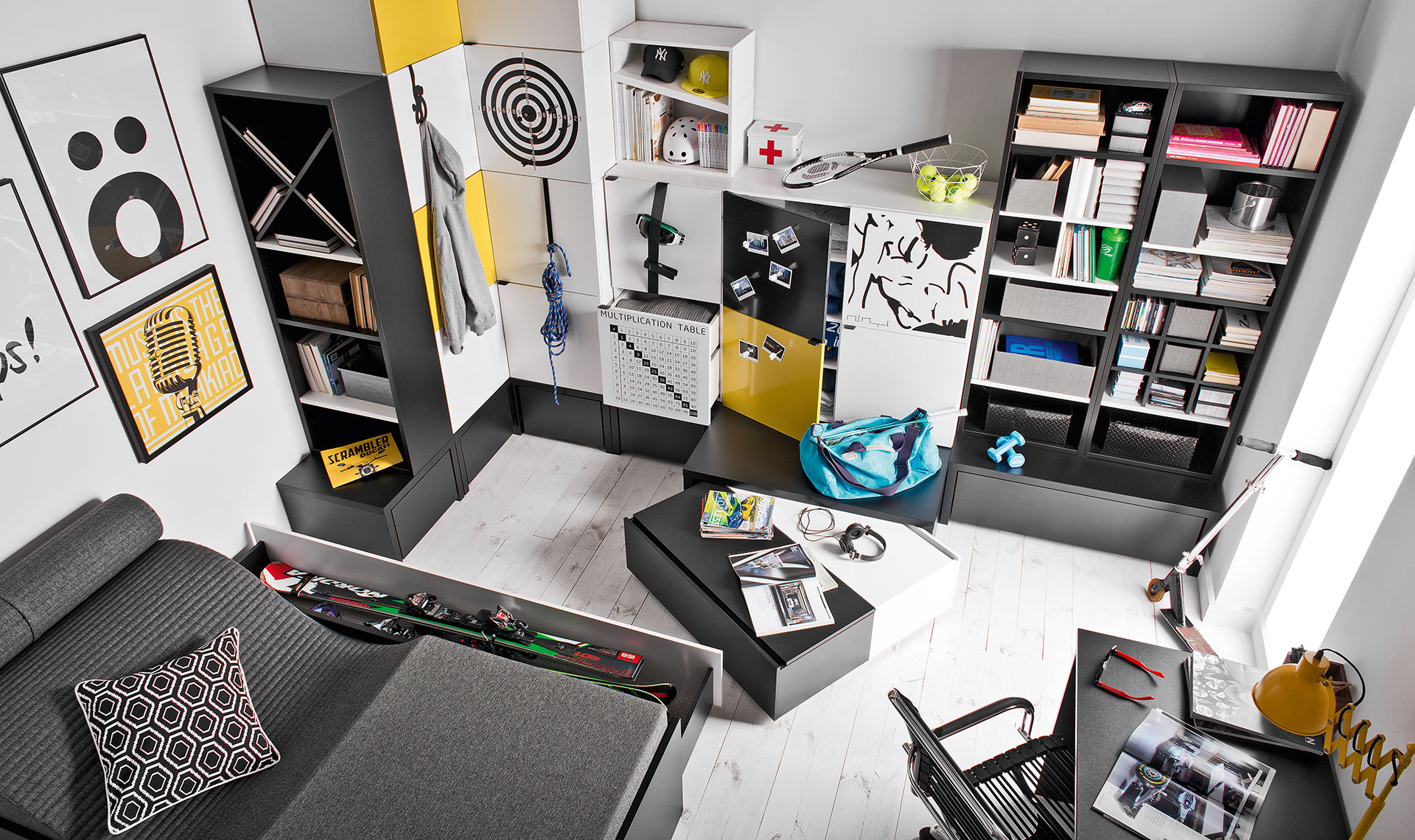 Podest stanowi funkcjonalną podstawę dla mebli z kolekcji Young Users. Występuje w wersji z mobilną szufladą bądź wysuwanym stolikiem, a dodatkowo sprawdza się jako siedzisko – wystarczy ułożyć na nim poduszki.