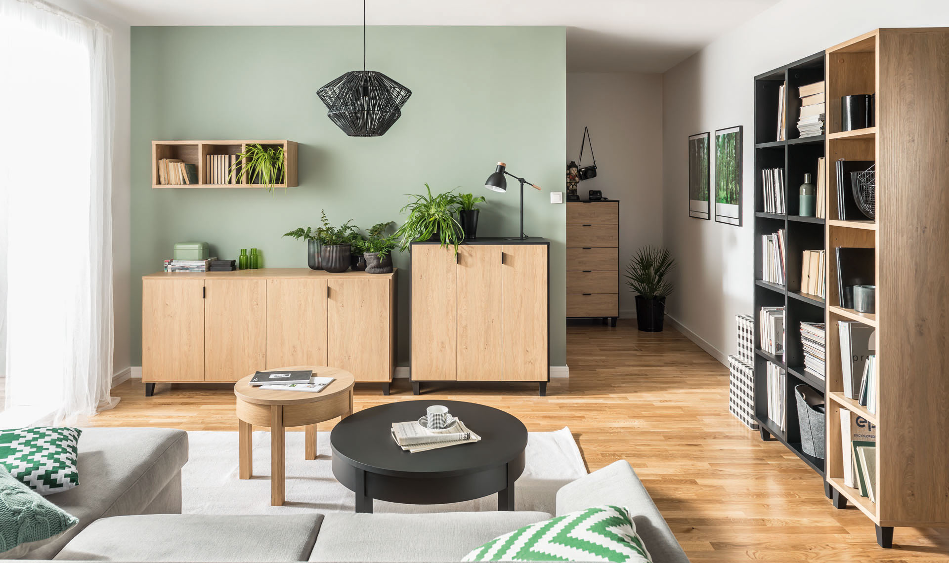 - Płyta meblowa laminowana lub malowana - w zależności od wybranej opcji kolorystycznej. Płyta laminowana występuje w kolorze: piaskowy beż, białym oraz w kolorze dębu. Płyta malowana z wykończeniem soft touch) występuje w kolorze czarnym.