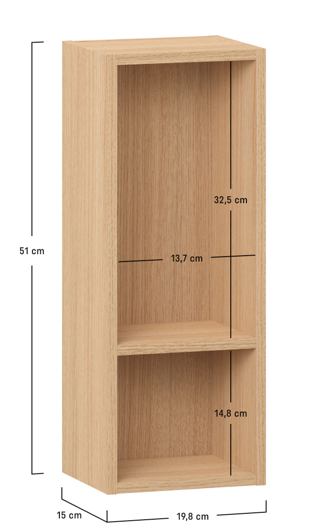 - Niesymetrycznie podzielone wnętrze półki sprawia, że mebel ciekawie się prezentuje, a praktyczne przestrzenie pozwalają łatwiej zorganizować przedmioty o różnych gabarytach.