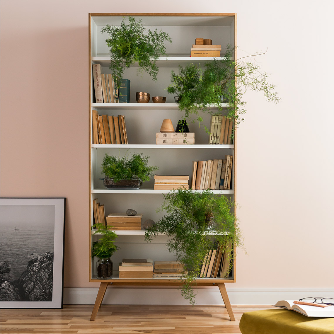 Minimalistyczny regał z kolekcji Nature z łatwością pomieści domową biblioteczkę. Na pojemnych półkach postawisz ulubione książki, doniczki z roślinami czy ozdobne pudełka z drobiazgami. Konstrukcja tego mebla jest na tyle mocna, że bez trudu wytrzyma dodatkowe obciążenia.
