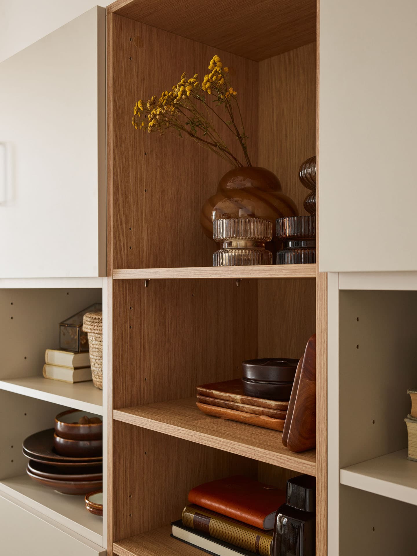 - Dzięki możliwości wstawienia drzwi regał sprawdzi się też w roli szafy. Fronty dostępne są w czterech rozmiarach – wszystkie posiadają system cichego domykania (wyjątkiem jest wybór systemu Push to open, który uniemożliwia zastosowanie cichego domykania).