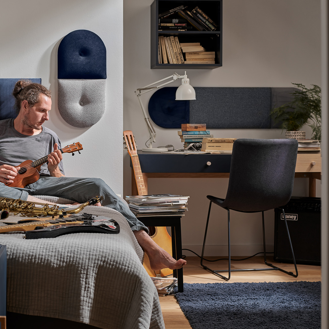 - Mały set składa się z 3 różnych paneli Soform: beżowego Oval 2, granatowego Oval 3 z guzikiem oraz granatowego Regular 1. Konkretne odcienie i tkaniny dobrała stylistka VOX.