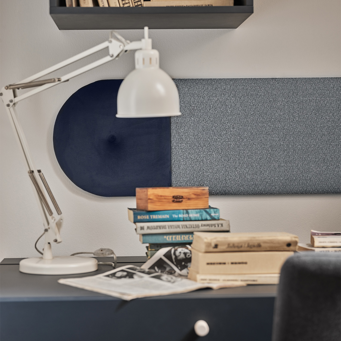 Mały set paneli tapicerowanych Soform w granatowo-szarej kolorystyce. Zestaw składa się z 3 elementów o eleganckim wykończeniu, które zdobią ścianę, nadając wnętrzu przytulności. Mogą pełnić przy tym praktyczną rolę.