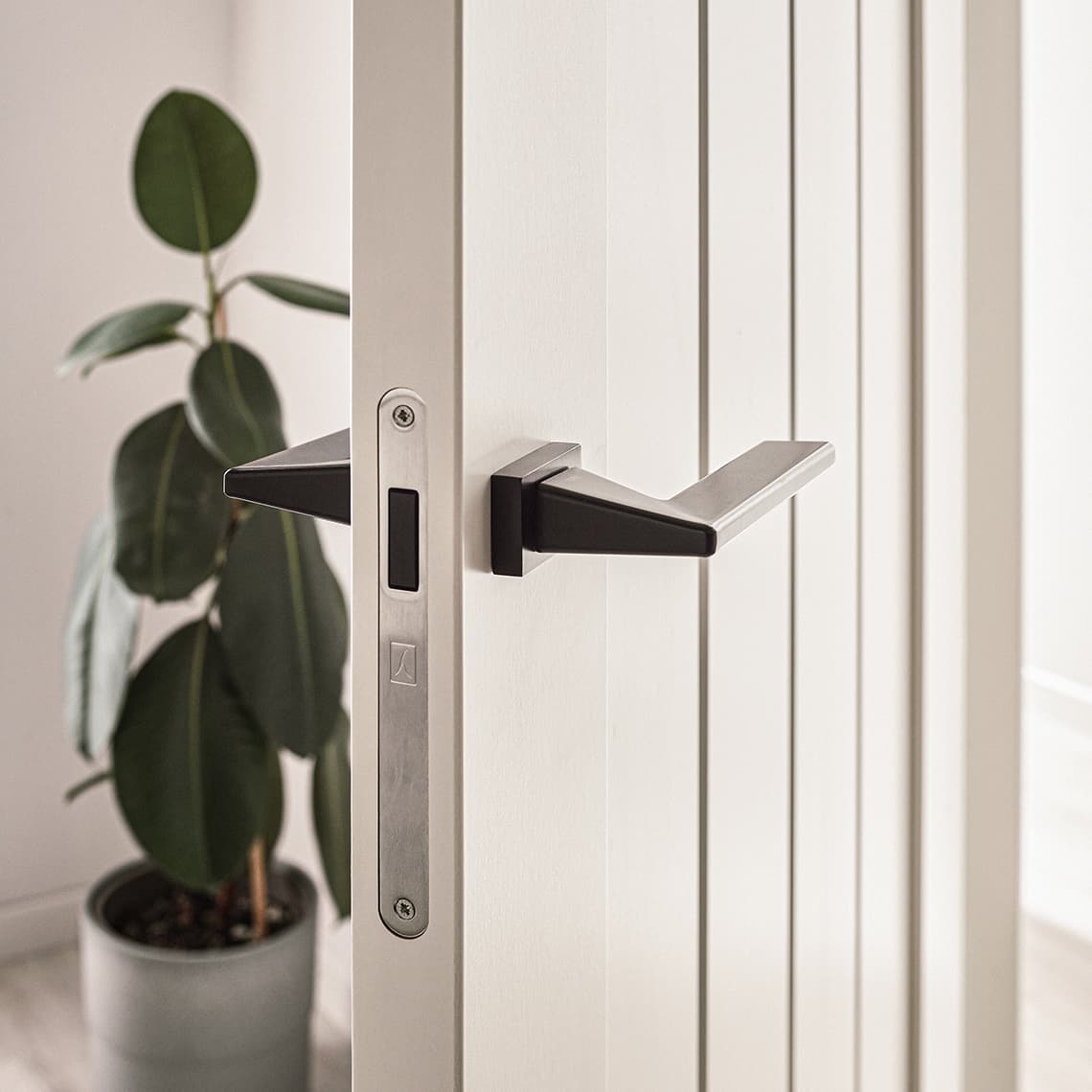 - Bezprzylgowa z 3 zawiasami krytymi DUO w kolorze chrom satyna. W wersji bezprzylgowej zamek magnetyczny rozstaw 85mm na klucz, na wkładkę, blokadę łazienkową.