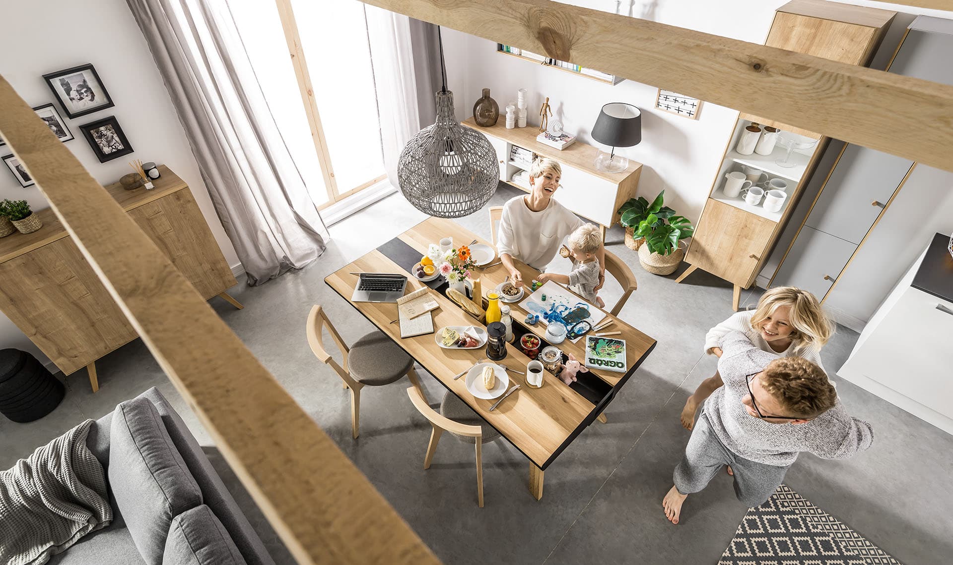 - Pionowe, przednie krawędzie oraz zaoblone uchwyty wykończone zostały z litego drewna dębowego, zabezpieczonego matowym lakierem.