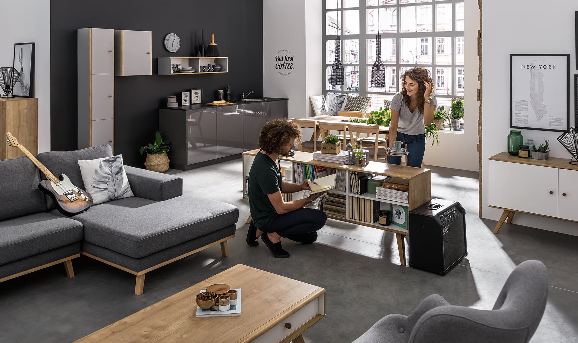 - Stałymi elementami wszystkich wersji kolorystycznych są uchwyty oraz pionowe, przednie krawędzie w naturalnym odcieniu drewna dębowego.