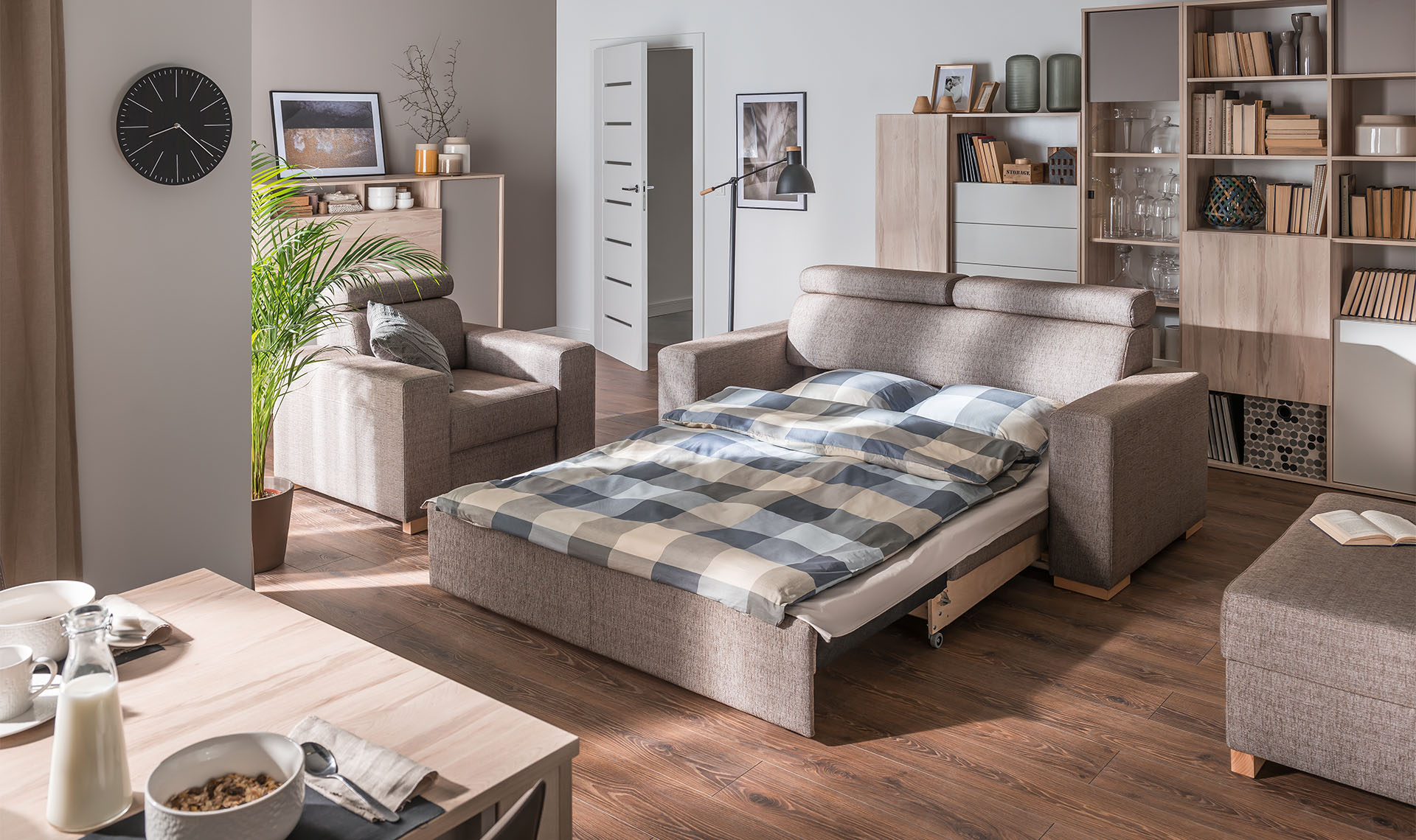 Sofa Milton z funkcją spania jest przeznaczona do wypoczynku w dzień i w nocy – może stanowić dodatkowe miejsce do spania. Geometryczny model został wyposażony w szerokie podłokietniki i regulowane zagłówki. Mebel jest produkowany na indywidualne zamówienie.