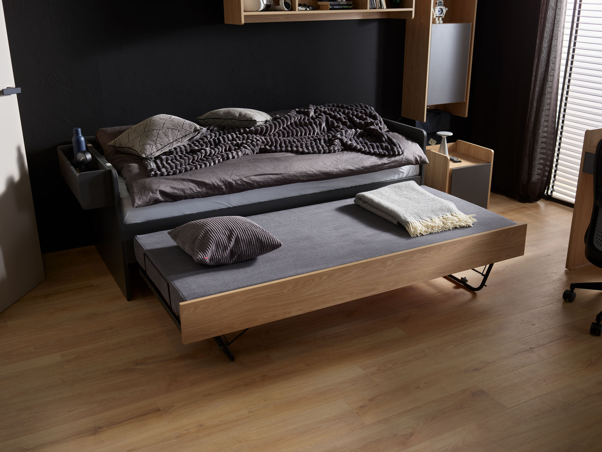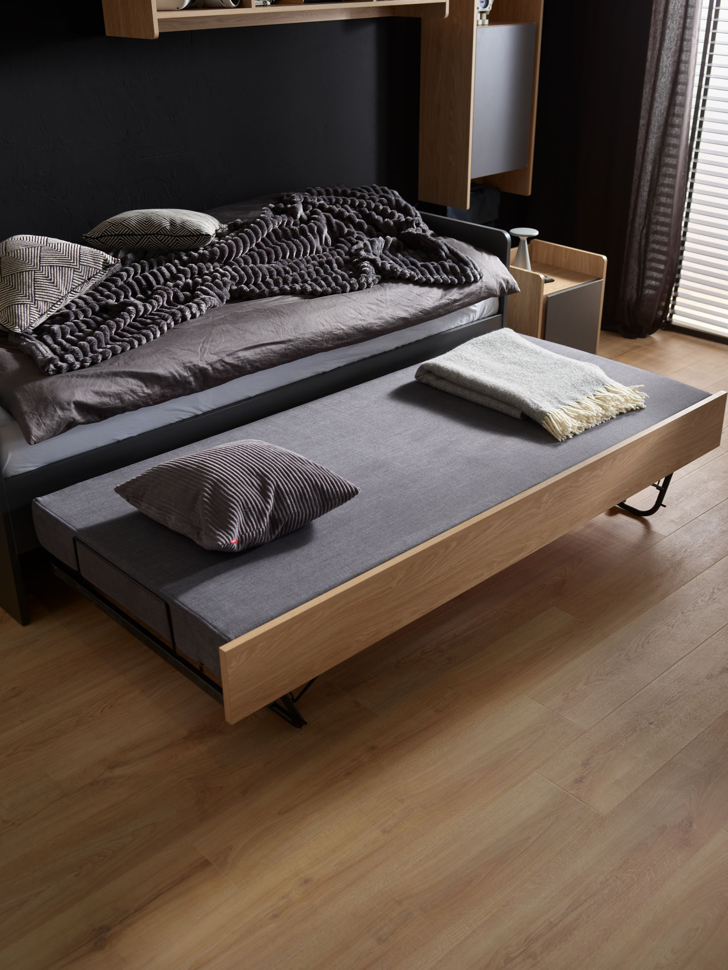 - Dzięki gumowanym kółkom, łóżko możesz wygodnie wsuwać i wysuwać, bez ryzyka zarysowania podłogi.