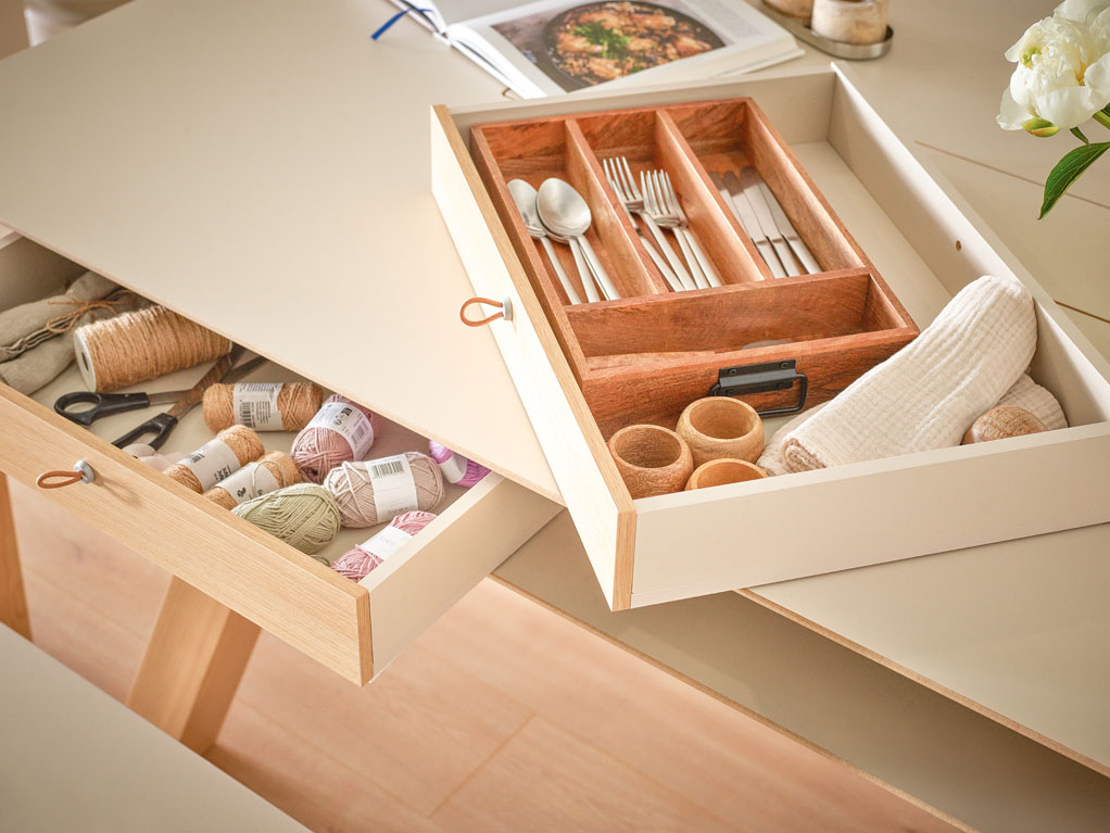 - Przestrzeń między dwoma blatami stołu to idealne miejsce na przechowywanie drobnych przedmiotów. To, co chce się ukryć, można schować w kupowanych osobno pojemnych szufladach. W stole zmieści się ich aż 6.
