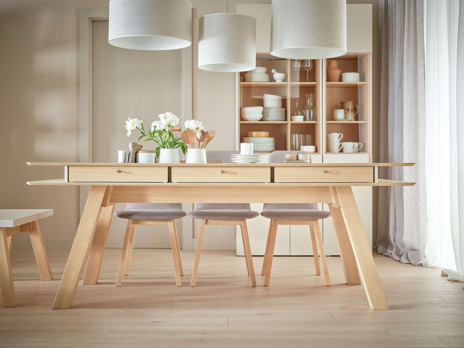 Ten stół będzie gwiazdą każdej kuchni czy jadalni. W funkcjonalnej wnęce w blacie umieścisz kwiaty, zioła czy sztućce albo zaaranżujesz ją w jeszcze inny sposób. Szuflady i wnęki pod blatem ukryją laptop po skończonej pracy lub dziecięce gry i artystyczne dzieła.