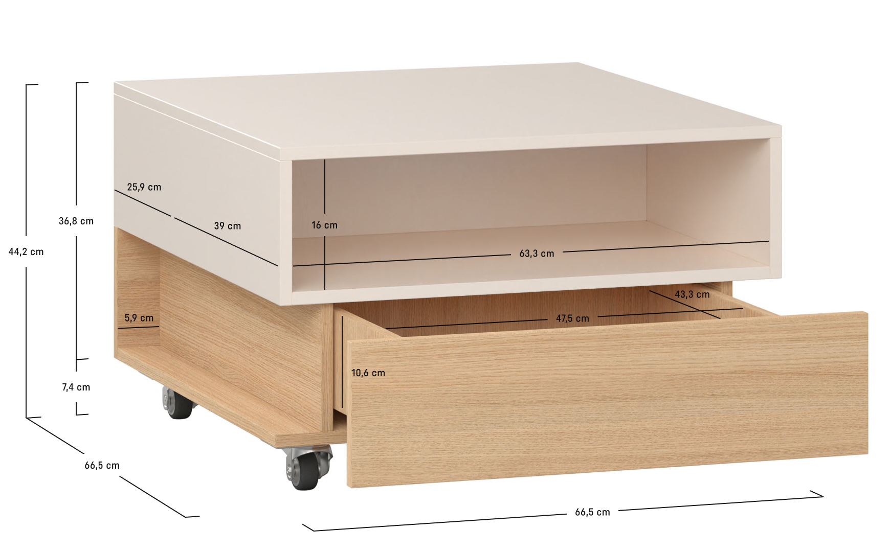 - Górna część stolika ma kolor piaskowego beżu.