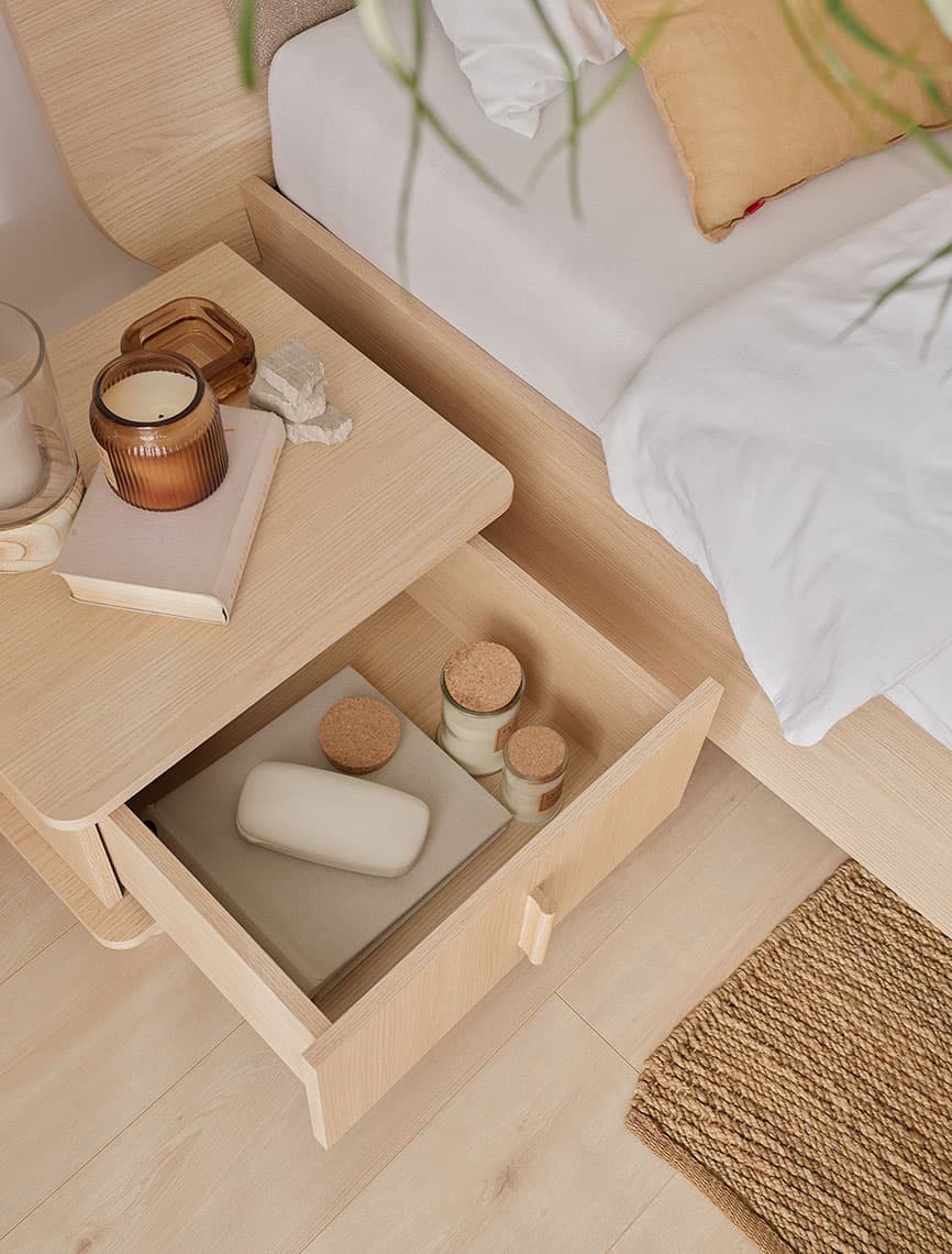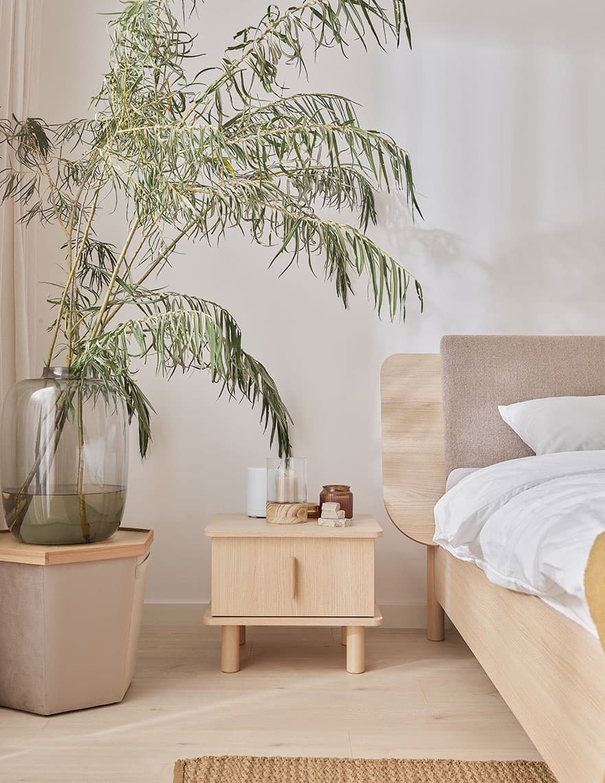 Stawiając stolik nocny OMM tuż obok łóżka, zyskasz wygodne miejsce do odkładania przedmiotów, z których korzystasz przed snem. Dzięki niewielkiej szerokości i wysokim nóżkom świetnie wkomponuje się nawet w małą przestrzeń.
