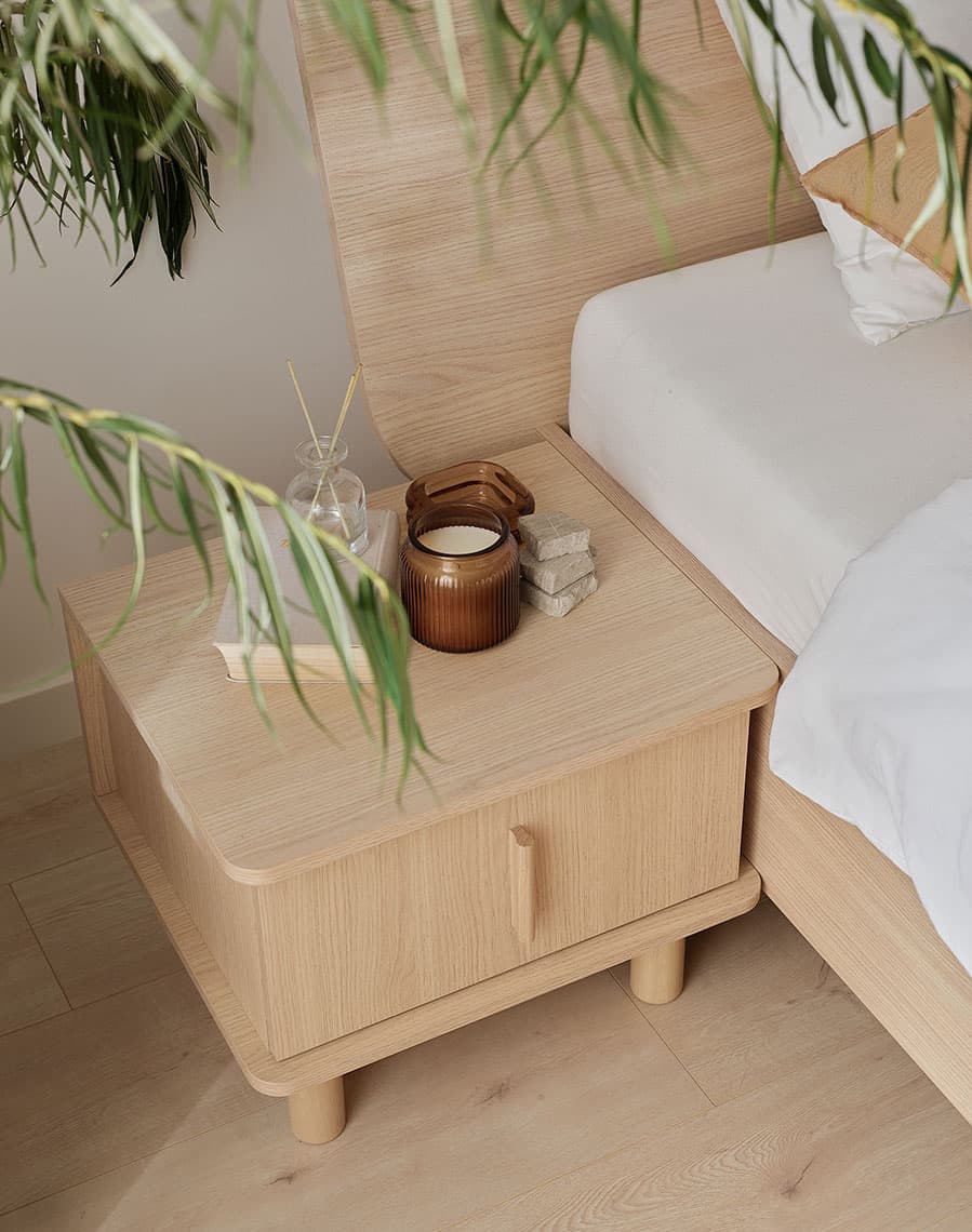 - Wizualizacja przygotowana w programie VOXBOX pozwala upewnić się, że szafka nocna z rysunkiem drewna dobrze wpasuje się w aranżację.