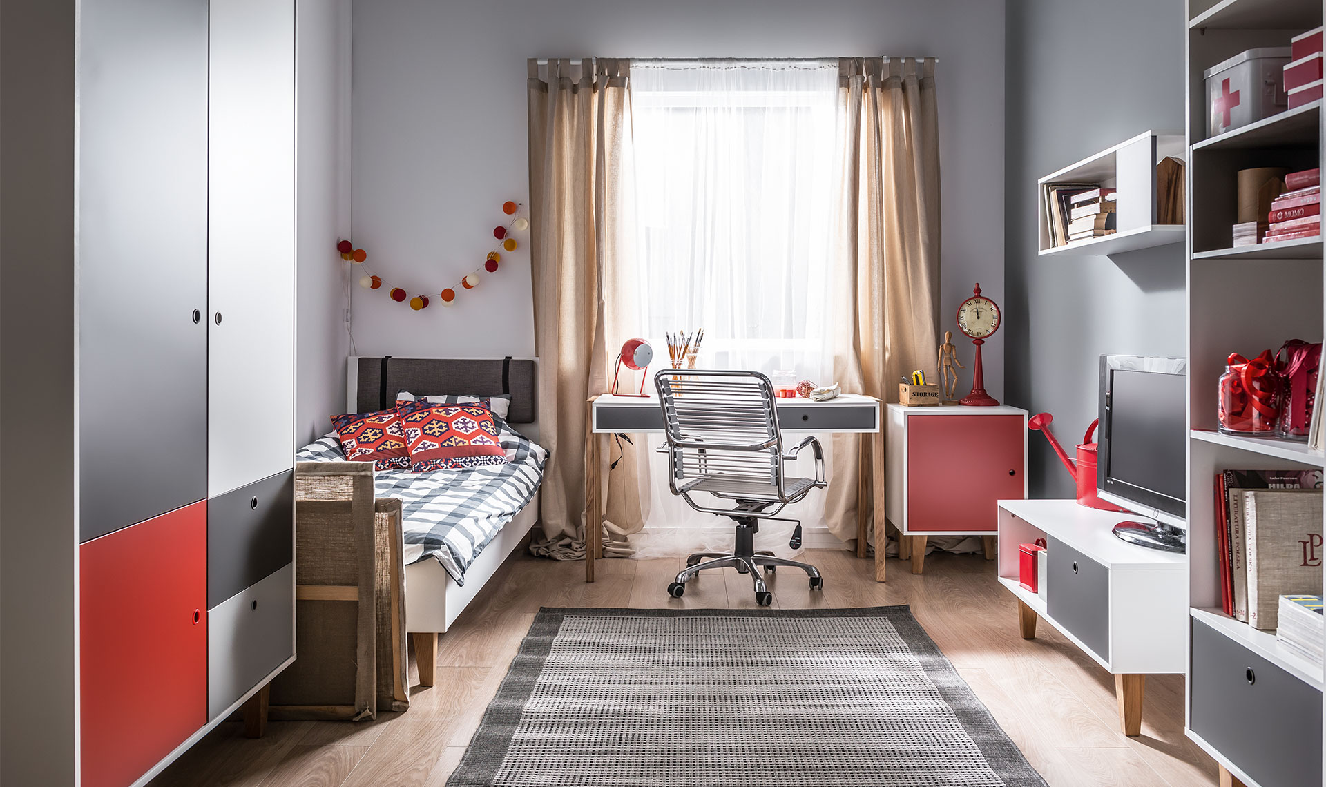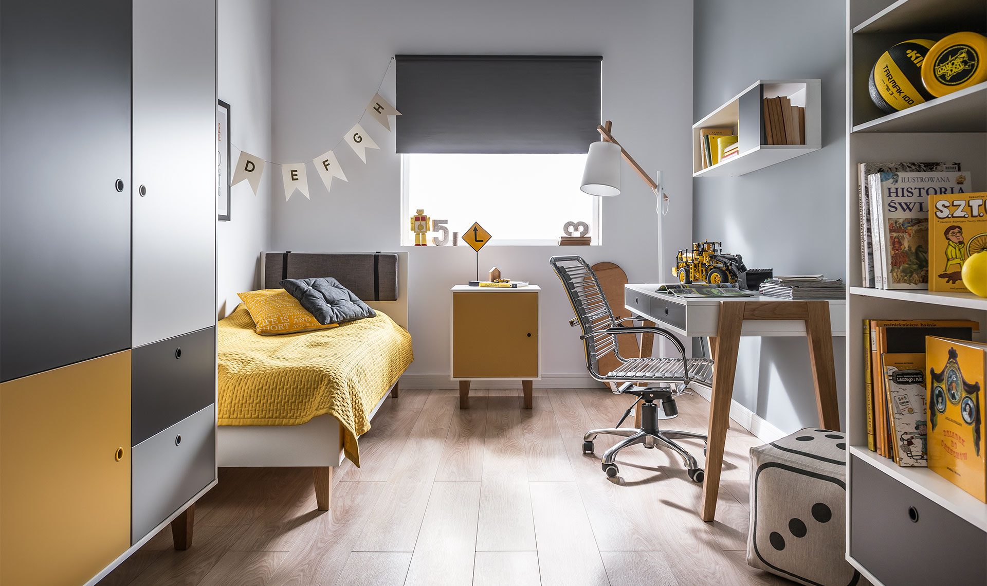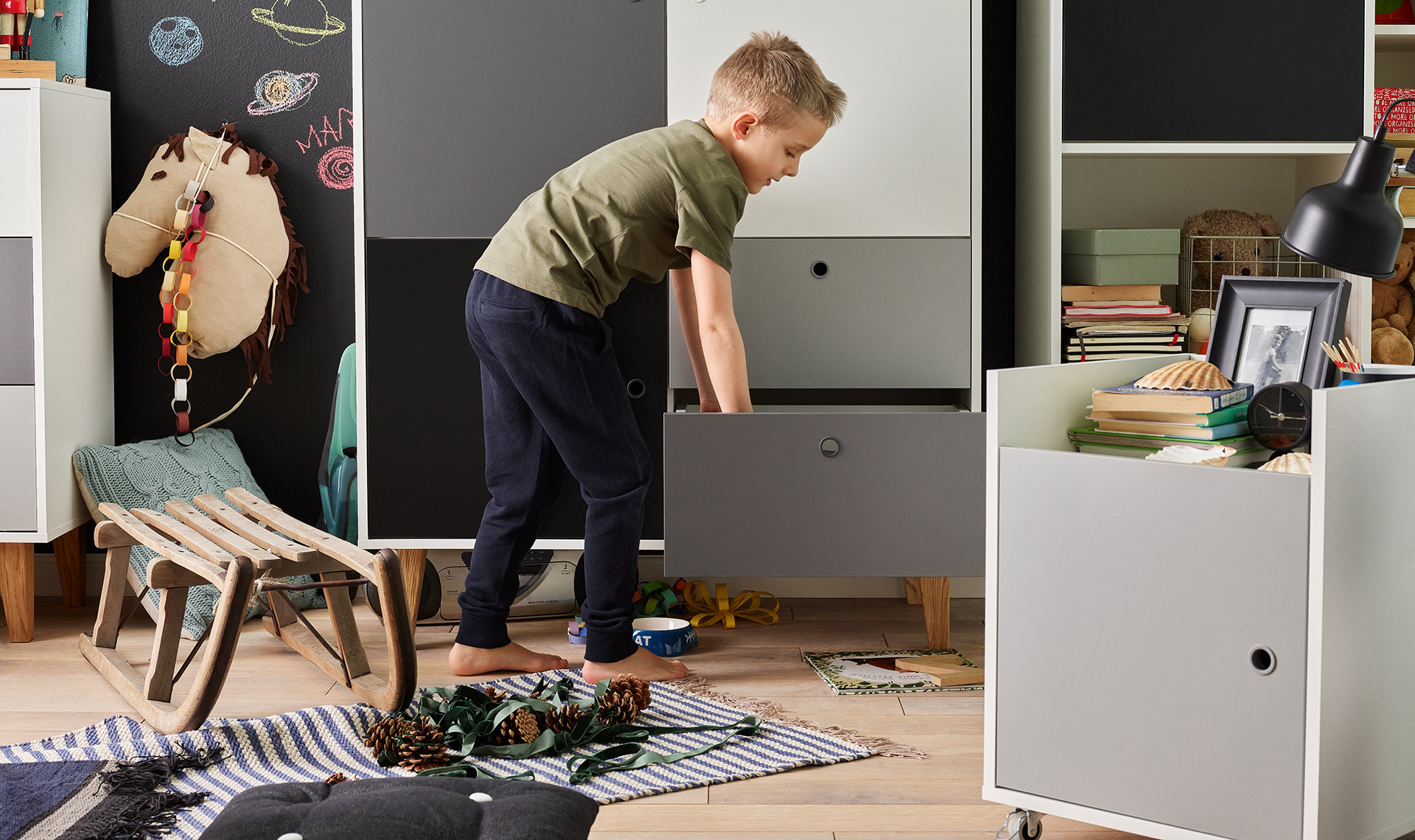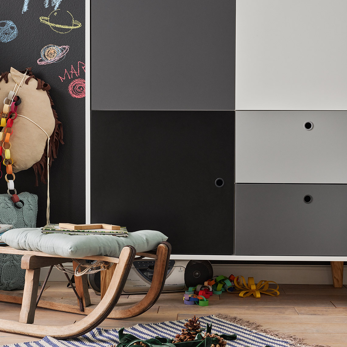 - U dołu szafy znajduje się mała szafka na wszelkie inne potrzebne przedmioty – gry, zabawki czy sportowe akcesoria. O kolorze jej frontu decyduje się na etapie zakupu – do wyboru jest aż 6 różnych wariantów. Dzięki temu mebel idealnie wpasuje się w gust oraz wystrój pokoju. Taki front można później dokupić pojedynczo i wymienić, gdy poprzedni się znudzi.