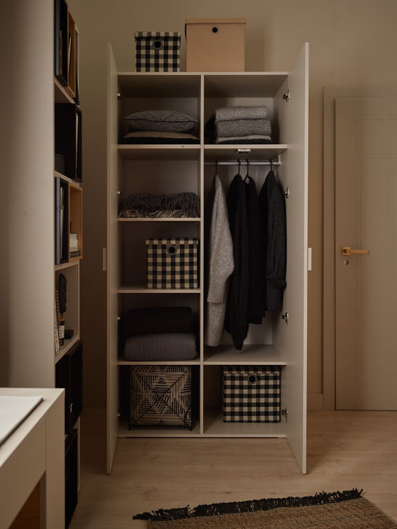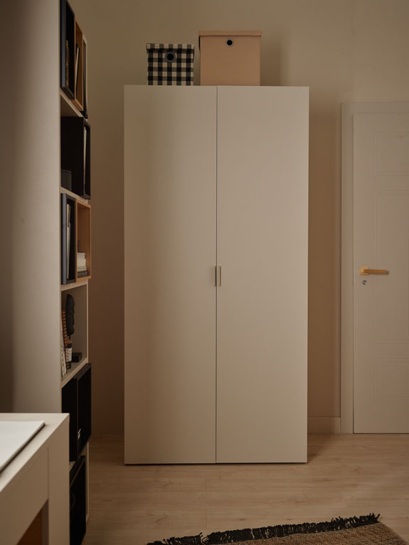 - Aby zwiększyć przestrzeń przechowywania, można dostawić z boku szafy regał boczny szafy 4-drzwiowej o wysokości 206 cm.