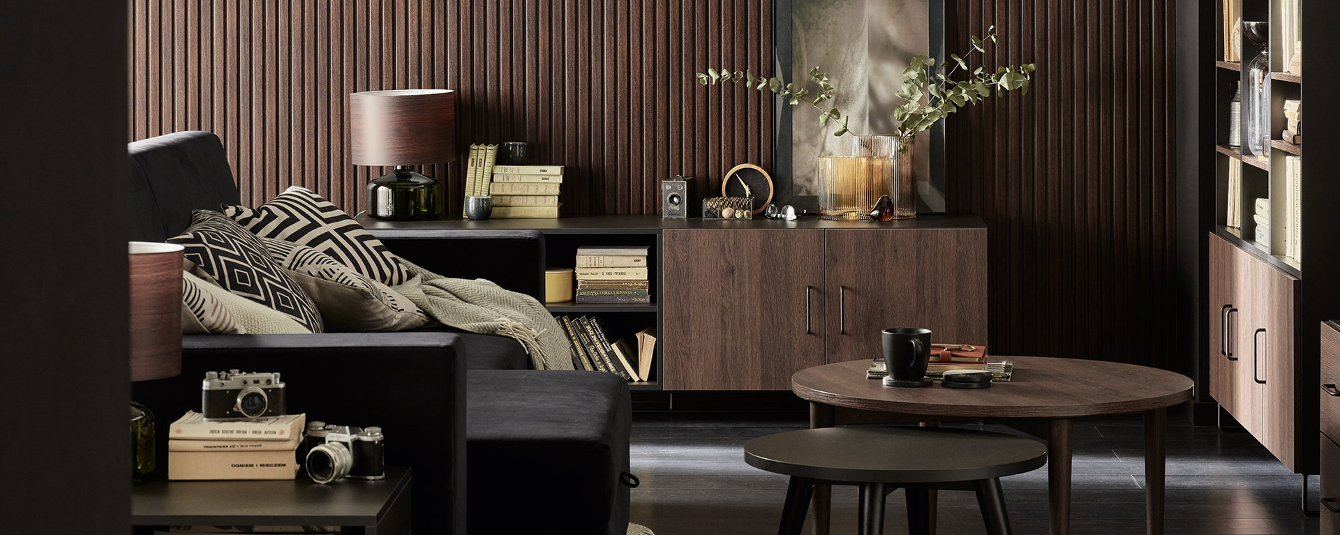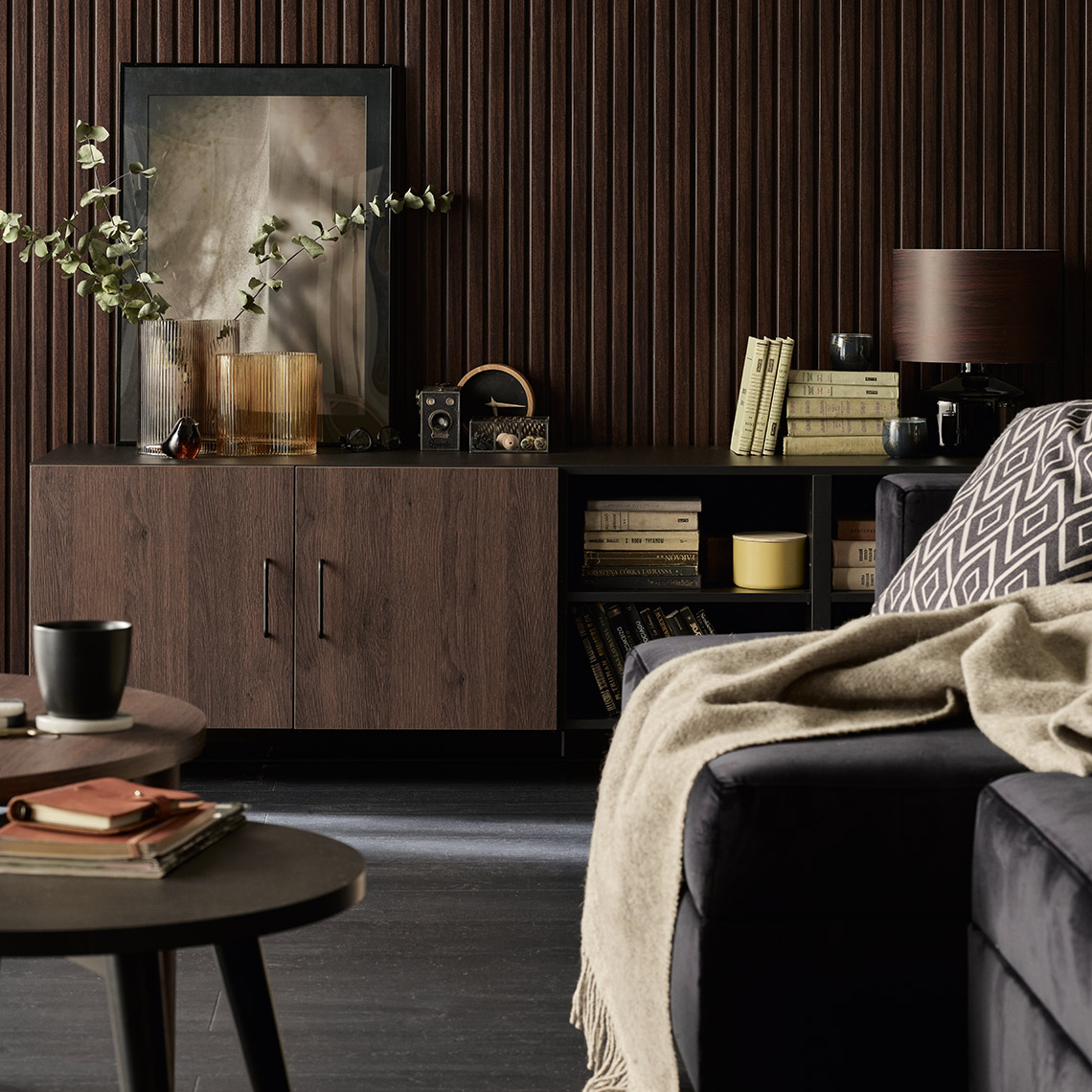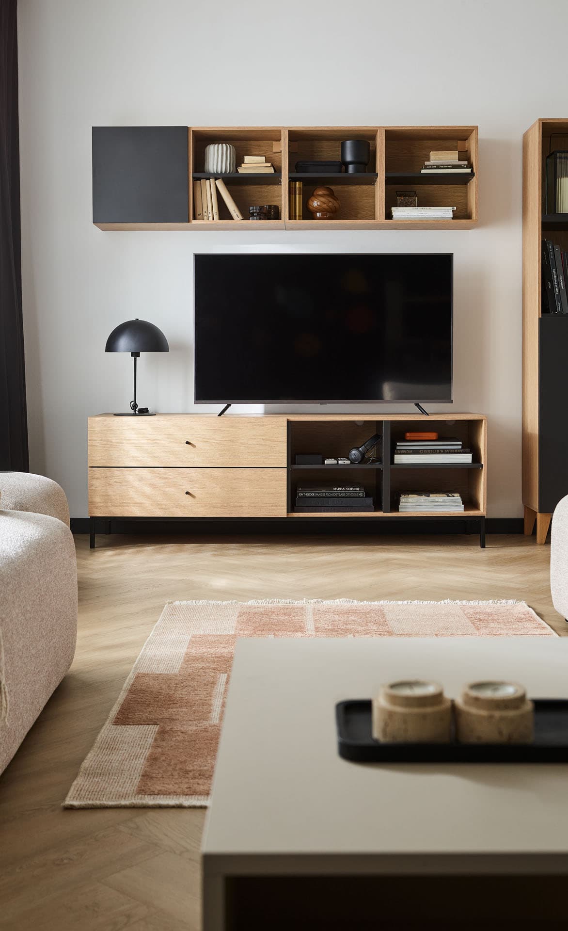 - Wnętrze szafki zorganizujesz dzięki szufladom i półkom w dwóch rozmiarach. Możesz zostawić je otwarte lub dobrać odpowiednie drzwi (podwójne lub pojedyncze).