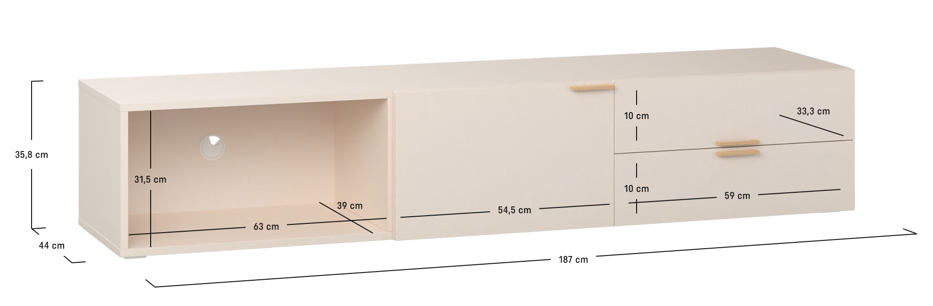 - Szafka RTV składa się z dwóch szuflad oraz zamkniętej i otwartej wnęki. Ich wymiary odpowiadają wielkości standardowych odtwarzaczy, konsoli oraz innych urządzeń, które można podłączać do telewizora. Ułatwia to ukrycie ich obudów.