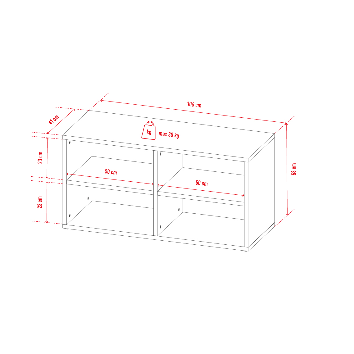 - Szafka zawiera 4 wnęki o takich samych rozmiarach. Każda z nich posiada przepust na kable, co pozwala dowolnie rozmieścić urządzenia, które wymagają dostępu do prądu.