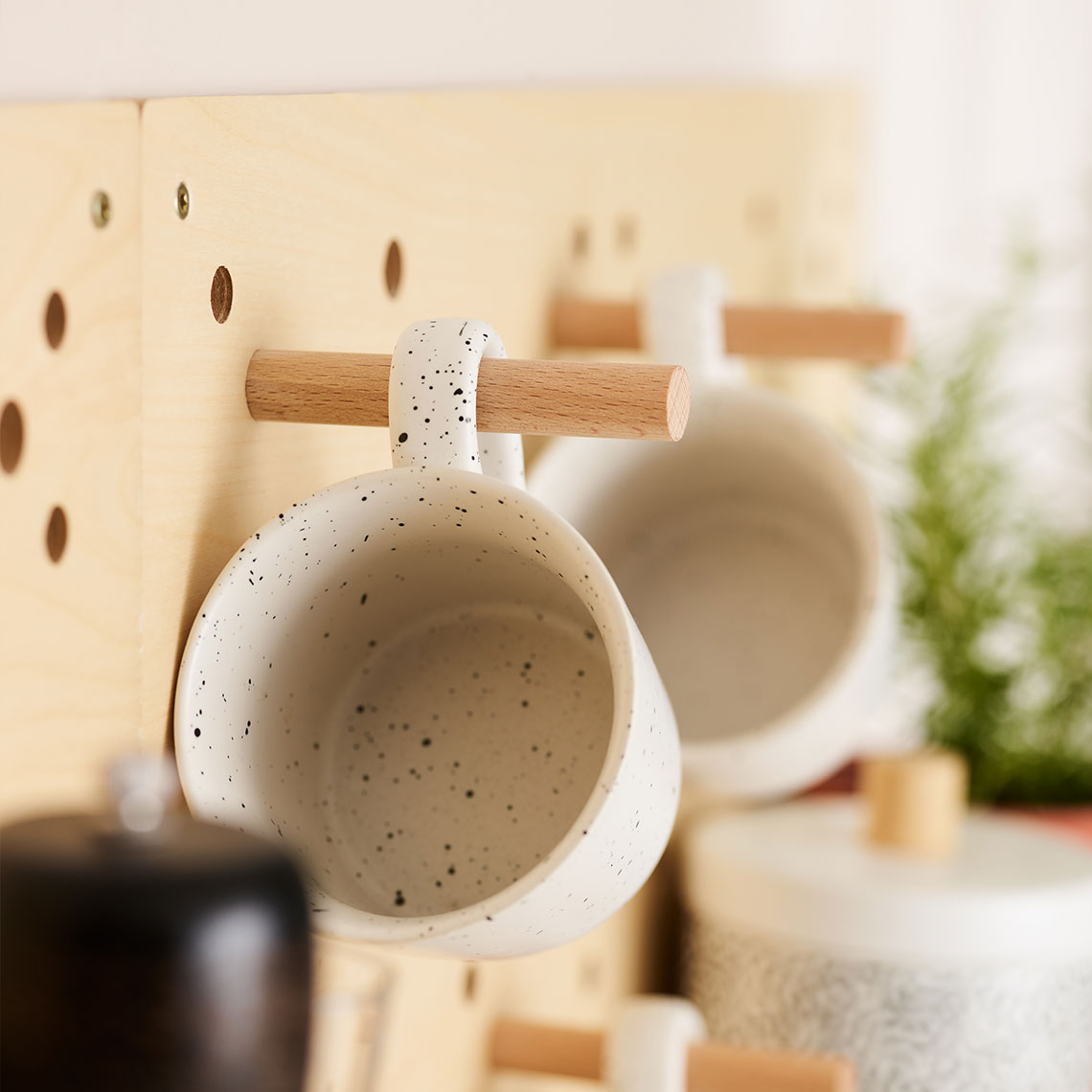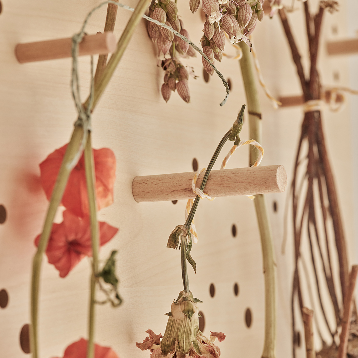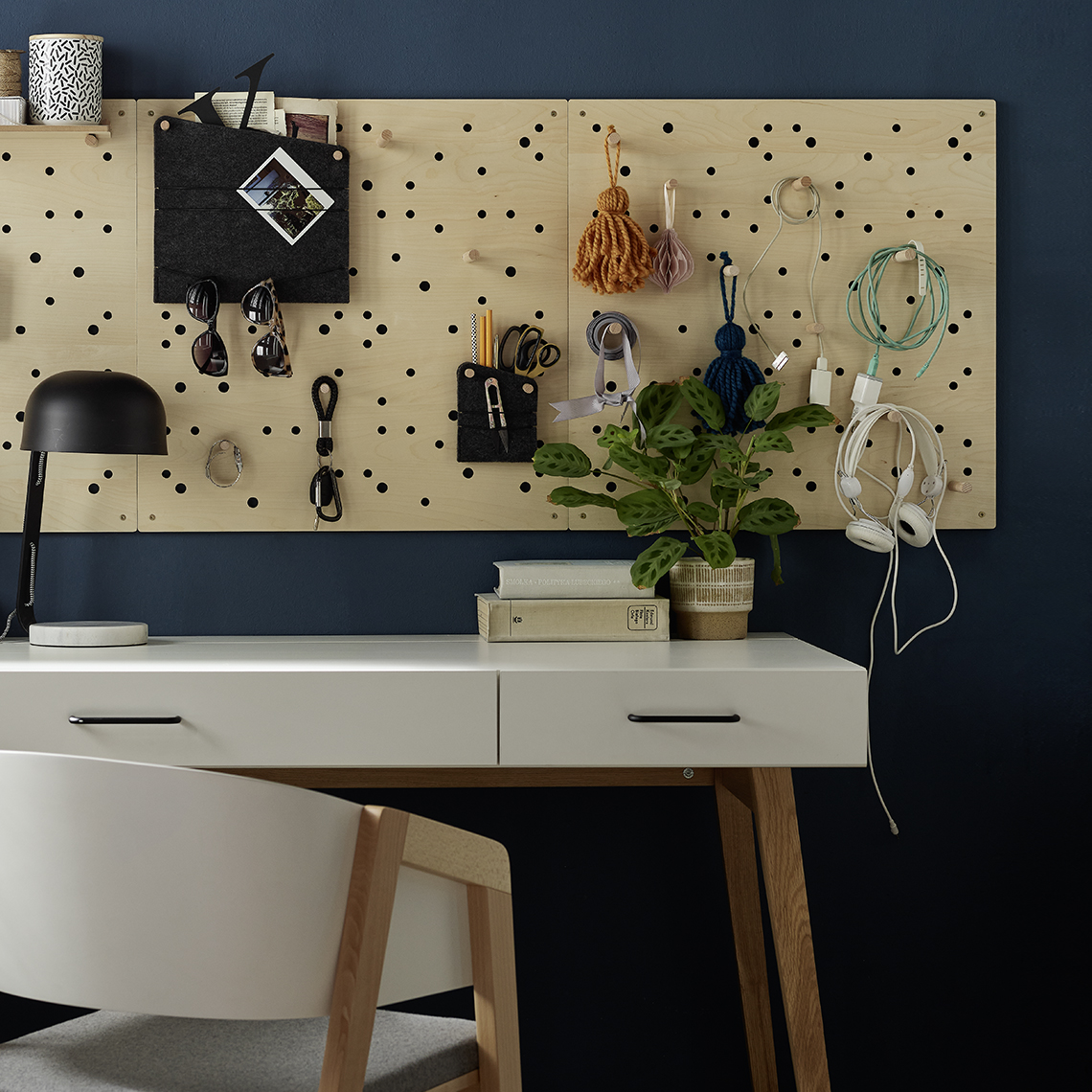 Zestaw na bazie tablicy Slot pozwala sprytnie wykorzystać wybrany fragment ściany. Wraz z nim zyskasz dodatkowe miejsce do przechowywania podręcznych rzeczy. W komplecie z panelem otrzymasz drewniane kołki.
