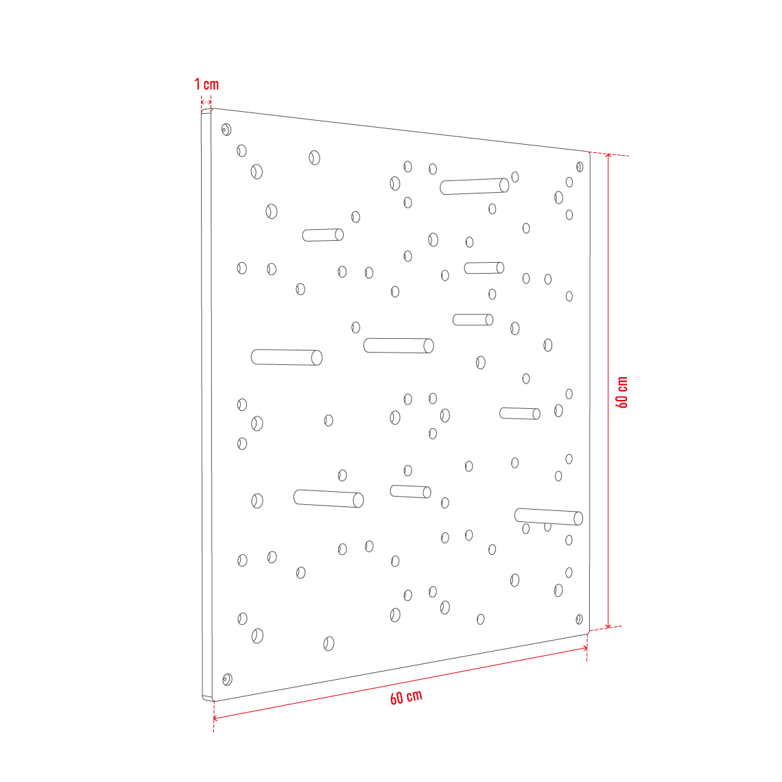 - Jeden panel pokrywa powierzchnię ściany o wymiarach 60 × 60 cm. Możesz połączyć kilka tablic w pionie lub poziomie i stworzyć aranżację dopasowaną do swoich potrzeb.