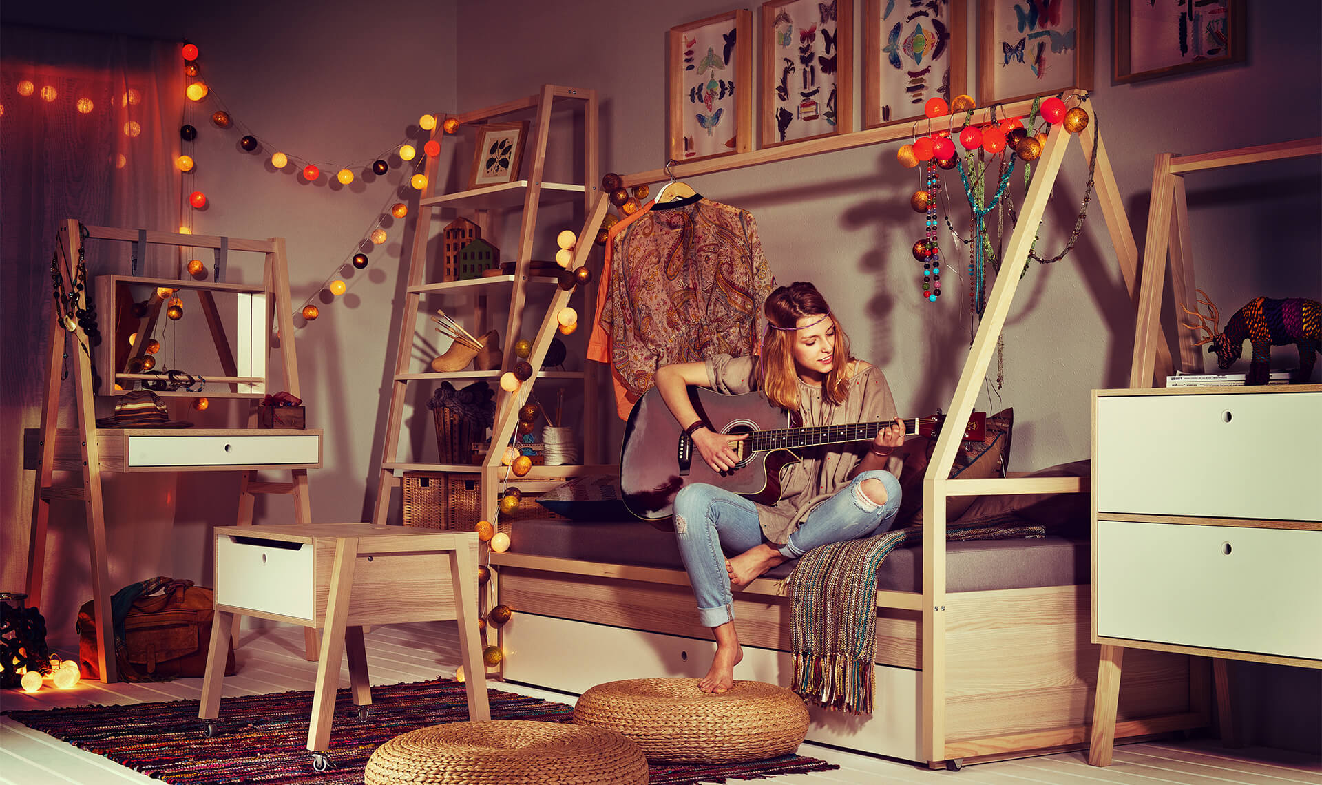 Toaletka z szufladą i relingiem z kolekcji Spot. Mebel można uzupełnić o pasujące lustro i stołek do siedzenia, tworząc praktyczny zestaw do sypialni lub pokoju nastolatki.