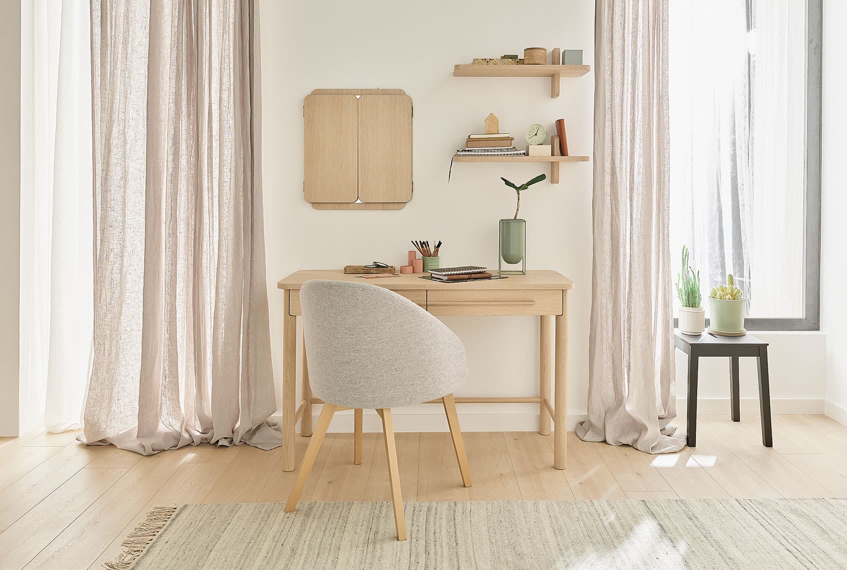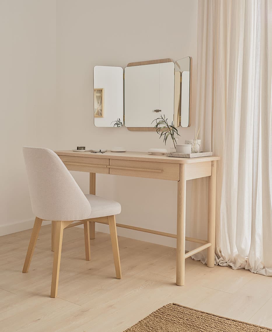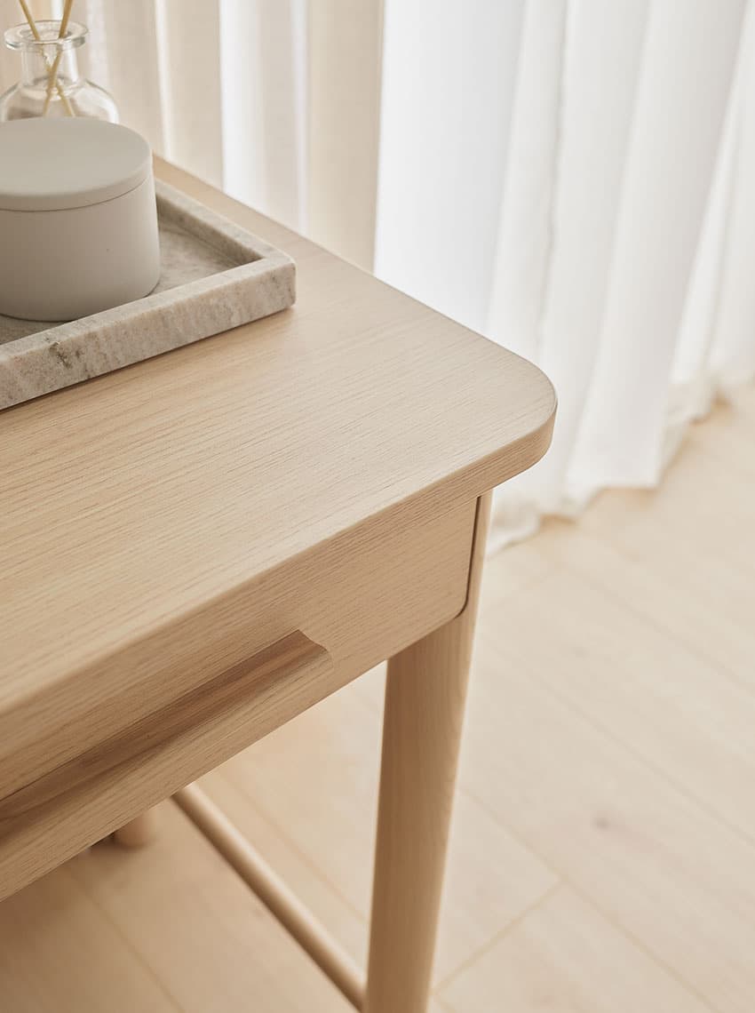 Z toaletką OMM łatwo urządzisz praktyczny kącik urody lub dzięki kompaktowej formie możesz ją wykorzystać także jako biurko. Ten subtelny mebel zachwyca nie tylko pięknymi dębowymi detalami, ale i funkcjonalnością. Niewielkie wymiary sprawiają, że zmieści się w każdej sypialni. Szerokie, pojemne szuflady pomogą uporządkować wszystkie akcesoria.