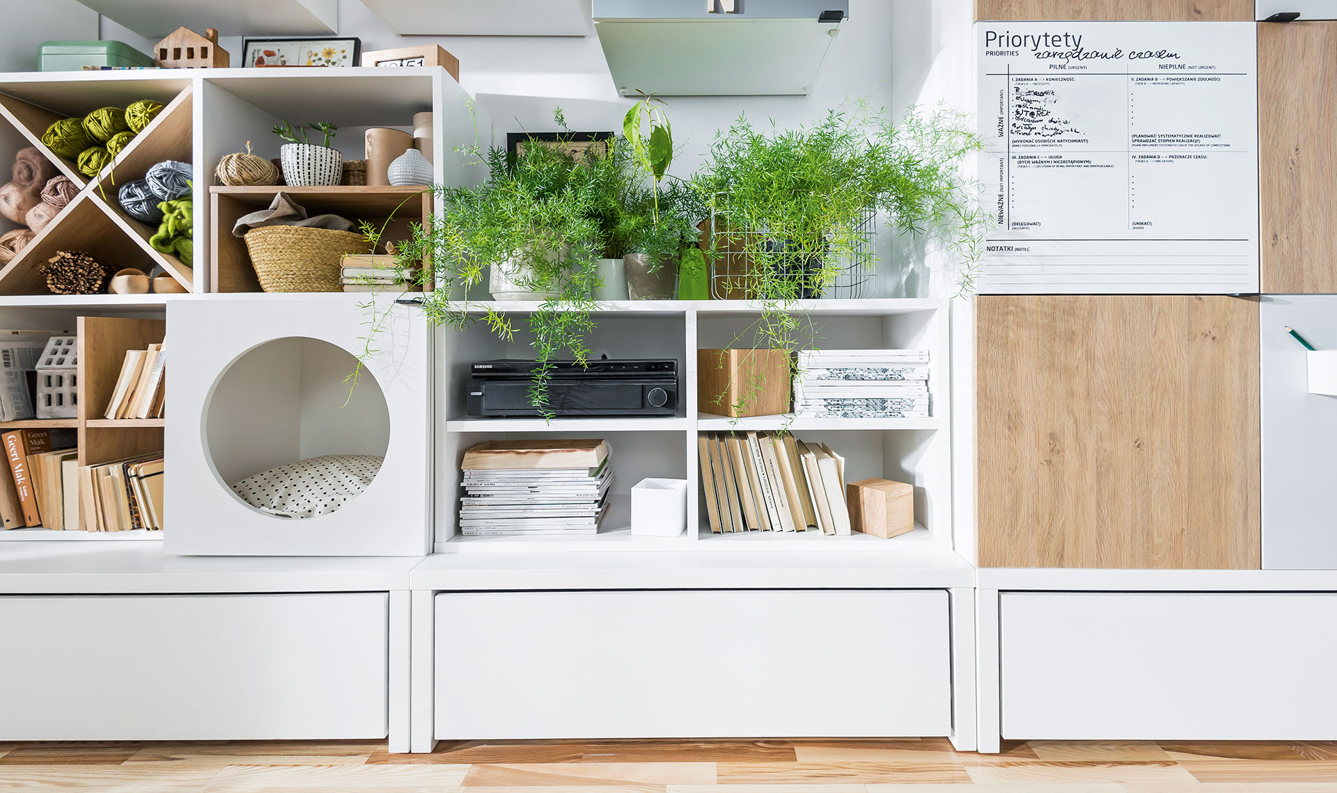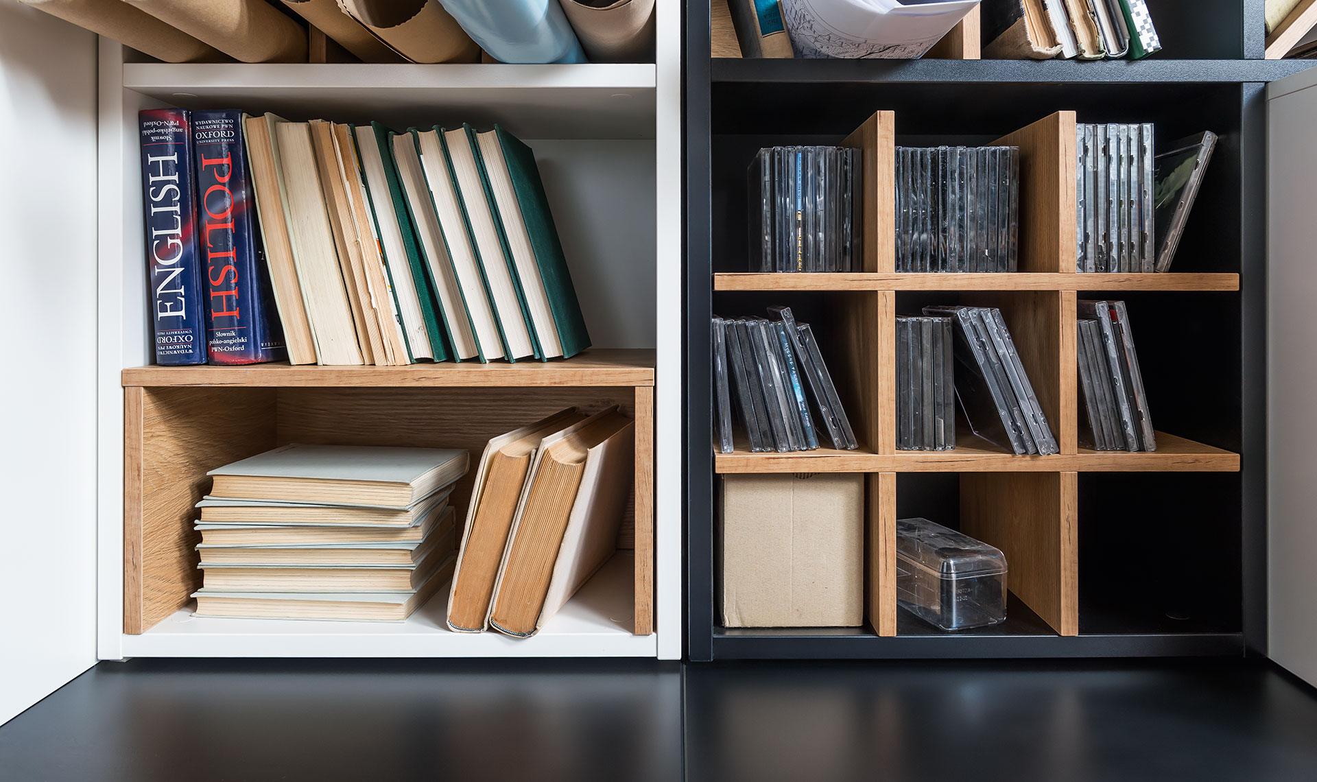 - Wyposażenie pozwala lepiej wykorzystać możliwości wnęki i ułożyć w niej rzeczy na dwóch poziomach. Ułatwia to segregację książek, płyt i innych przedmiotów.